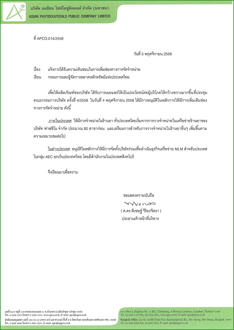 หนังสือ แจ้งการได้รับความเห็นชอบในการเพิ่มช่องทางการจำหน่าย